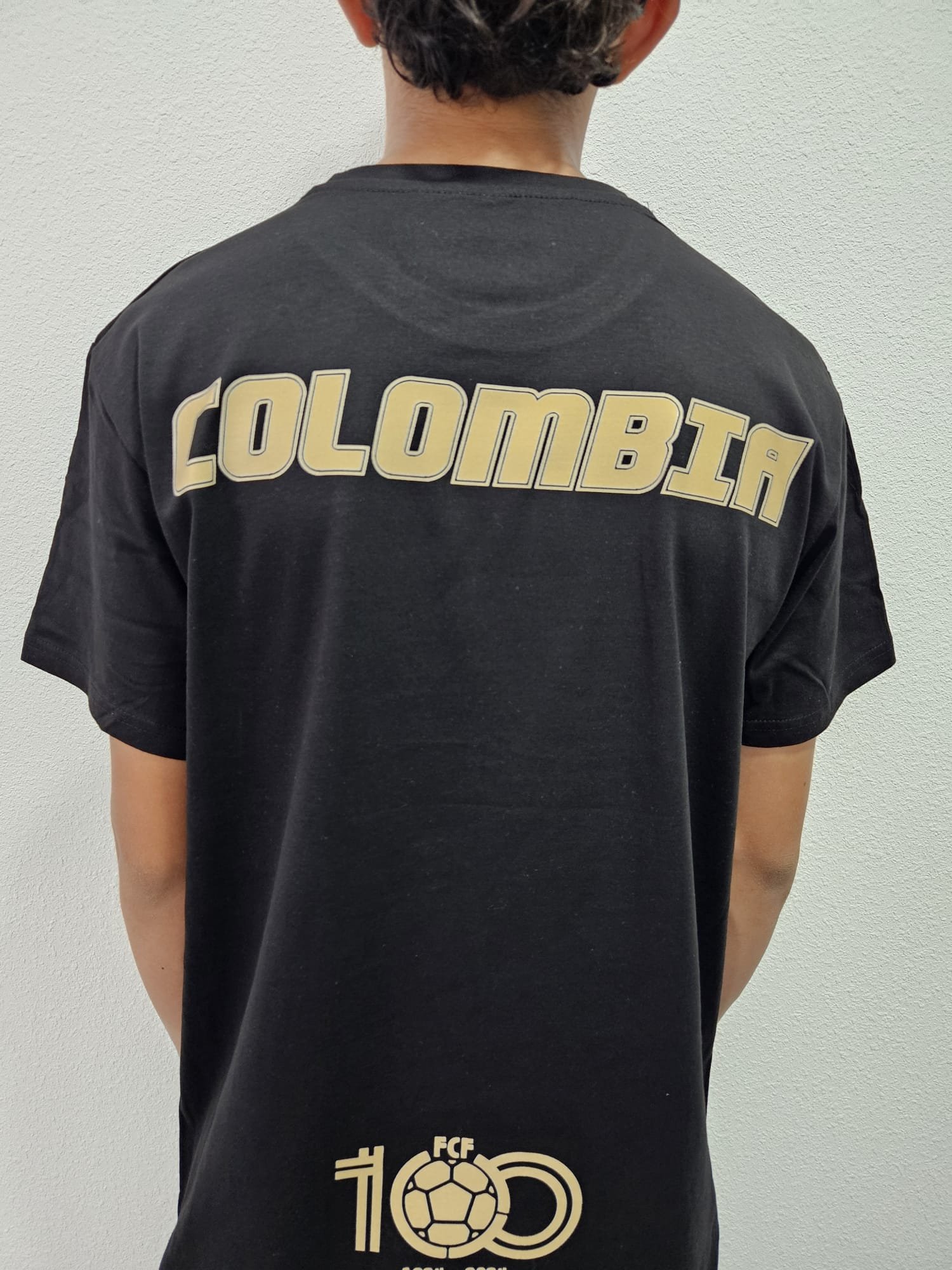 • Diseño exclusivo del Centenario, en versión adaptada a tallas infantiles, que incluye escudo de la selección Colombia y escudo del centenario en la parte delantera y texto de Colombia y escudo del centenario en la parte de atrás.